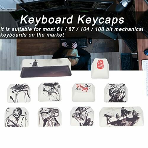 10-key DIY PBT keycaps set compatible with most 61/87/104/108-key keyboards. Sublimation-printed martial arts patterns, OEM height, durable matte finish, easy replacement, includes 10 keycaps for a complete DIY set and long-lasting.
