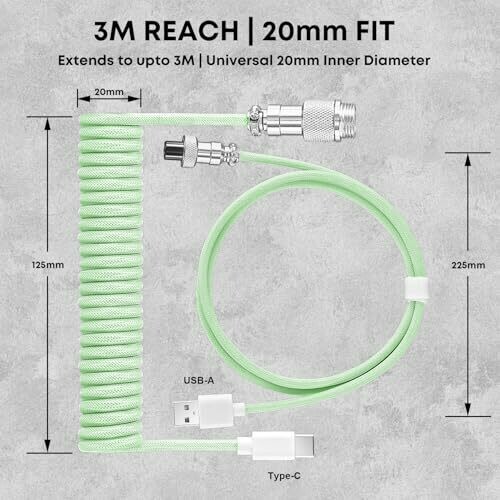 Tunghey Coiled Keyboard Cable, Nylon Braided Usb C to Usb A Tpu Cable for Mechanical Gaming Keyboard, with Detachable Metal Aviator for Custom Keyboard 3m (green)