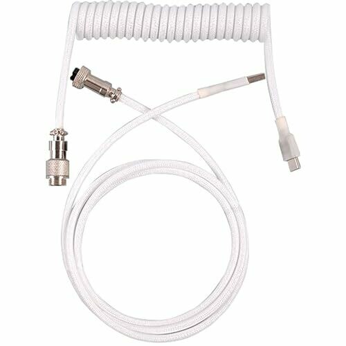 Premium tunghey coiled keyboard cable in white with nylon braid, USB-C to USB-A, and a detachable metal aviator. Coiled design saves desk space while flexible, tangle-free use across compatible keyboards, with durable copper conductors and reinforced shielding.