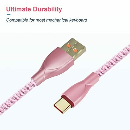 • Stylish pink UCINNOVATE coiled USB-C to USB-A cable designed to elevate your gaming keyboard setup.