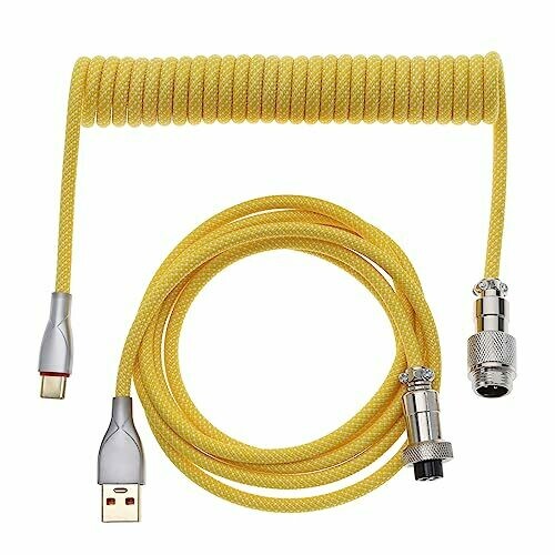 EMSea coiled cable with a yellow braided finish for keyboards and devices. Detachable aviation plugs allow quick swaps and replacements. Includes Type-C and USB aviation plugs to cover keyboards, tablets, and phones. Flexible braided design resists twists for long-lasting use. 1.5-meter length.