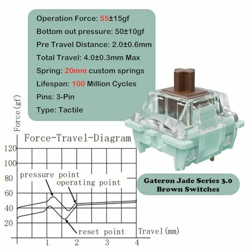Experience tactile, balanced feedback from the Gateron Jade 3.0 series for versatile typing. Smooth rebound with long life up to 100 million actuations. 55g actuation delivers precise tactile confirmation with quiet, consistent keystroke.