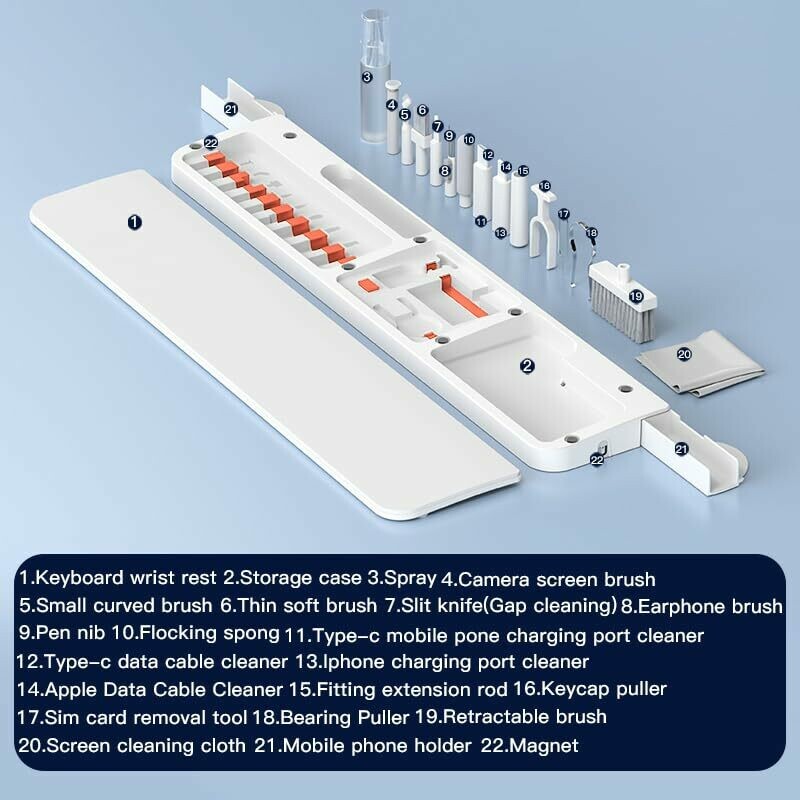 All-in-one kit designed for cleaning, protecting, and organizing your workspace, perfect for office typing and device care. Includes 22 tools, a soft wrist rest, and a magnetic storage lid for easy access and quick organization. Wrist rest helps reduce hand fatigue during long typing sessions.