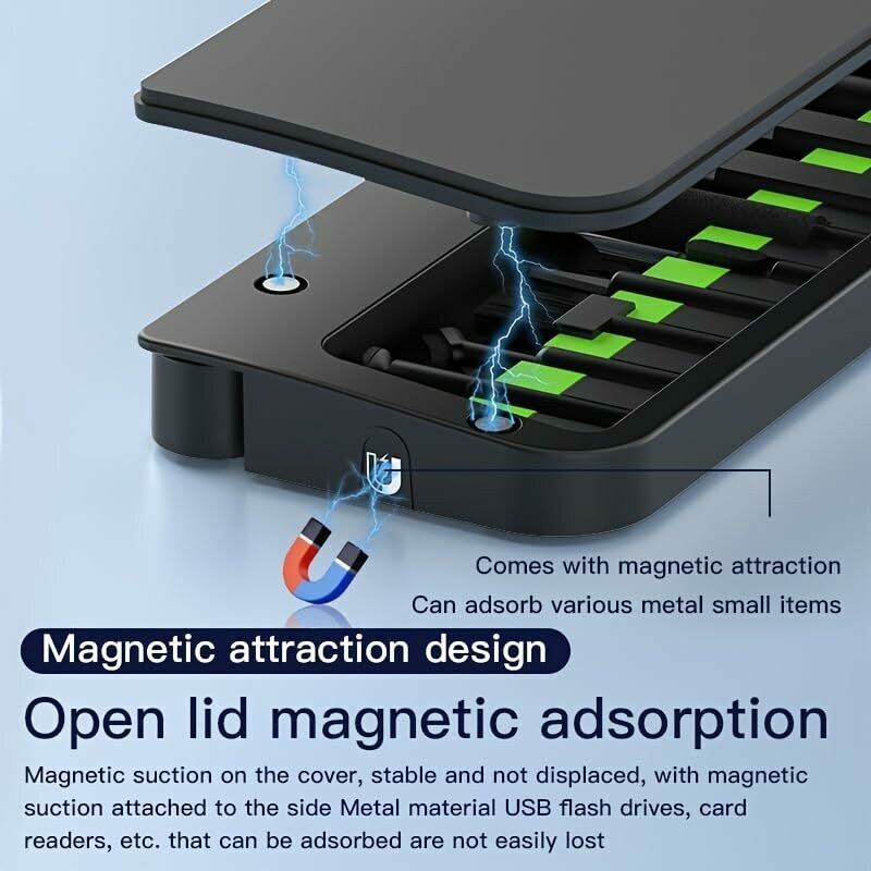 • Magnetic design offers stable storage and easy attachment of accessories, with magnetic adsorption on the cover and sides.