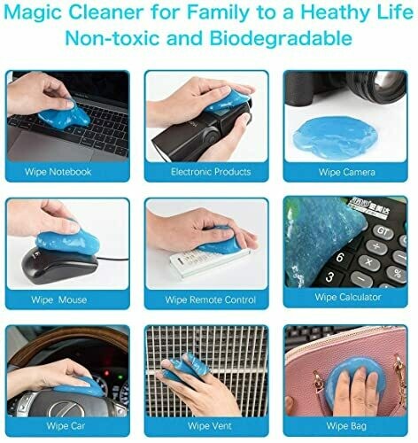knead, apply to the surface, press gently, roll, and lift to remove dirt; suitable for keyboards, computer accessories, air vents, dashboards, and similar components.