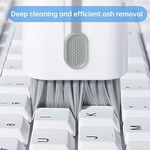 All-in-one keyboard cleaning kit with seven integrated tools for keyboards, screens, and electronics. Includes silicone nib, mini brush, flocking sponge brush, large cleaning brush, keycap puller, screen wiper, and screen cleaning fluid. Compact, portable and surface-safe for travel.