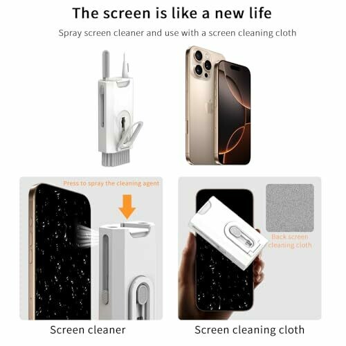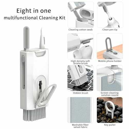 Includes an 8-in-1 cleaning tool with a high-density soft bristle brush, cleaning swabs, microfiber cleaning cloth, key puller, and screen cleaning spray nozzle. Retractable hidden brush provides soft, high-strength bristles for keyboards and delicate surfaces. Screen and lens cleaner features a spray bottle and washable microfiber cloth to remove fingerprints, smudges, and dirt from screens and camera lenses. Accessories for headphones and earbuds cleaning include a pen tip, soft brush, and cleaning swabs for charging cases, earphone tips, and meshes. Compact and portable design is lightweight and easy to carry and store, and can function as a phone holder during cleaning.