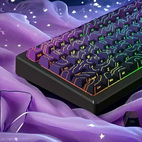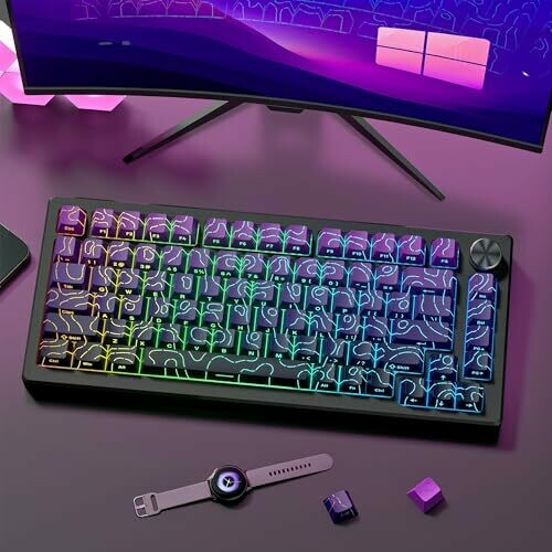 Dagaladoo 75% mechanical keyboard keycaps feature a vibrant gradient purple topographic design that shines through, with side-printed legends for backlit visibility. Doubleshot PBT, Cherry Profile, and broad layout compatibility ensure comfortable typing and easy installation with included 135-keycap set and puller.