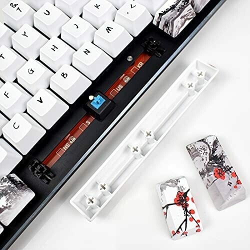 The 71-key Plum Blossom keycap set is compatible with 61/64-key and 60% keyboards. Spacebar size is 6.25u. Material: