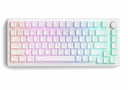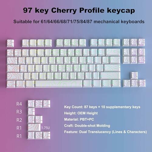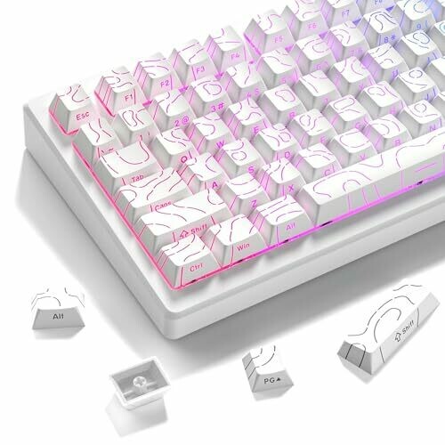 Elevate your setup with White Topographic keycaps that glow through backlighting for a striking look. Durable PBT with double-shot legends and side-printed shine-through, Cherry profile for comfortable typing, compatible with 61/64/66/68/71/75/84/87 keyboards, 97-key set.