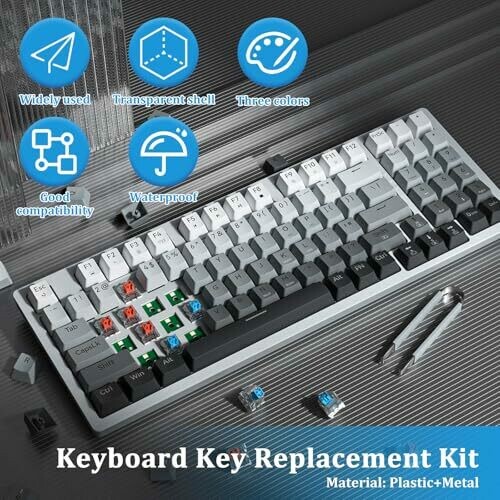 Serves as tactile keycap options with reliable actuation; visually distinguishable blue, red, and brown switches.