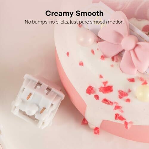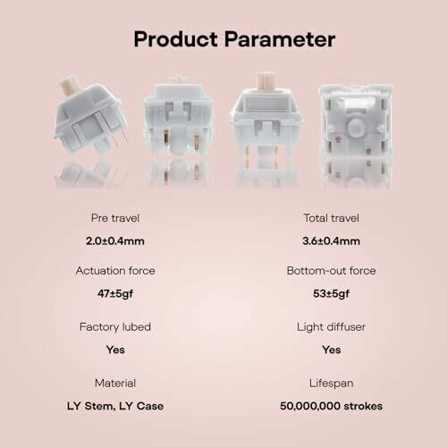 Experience a smooth linear keystroke with factory lubrication for clean actuation and reduced friction. LY material stem and housing provide low friction and stable keyfeel for long-lasting performance. 5-pin MX-compatible design for easy keycap swaps and broad keyboard compatibility. Creamy aesthetics.