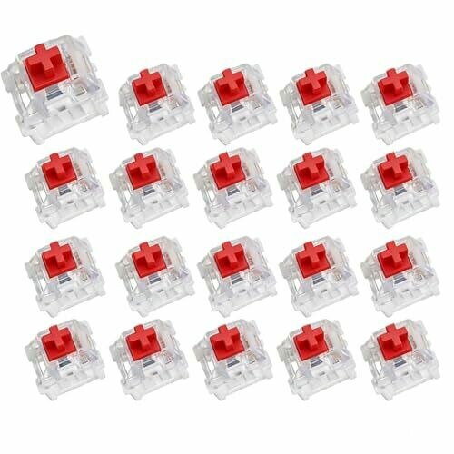 Red switches deliver a crisp click and fast keypress response for reliable performance. Transparent housing boosts lighting effects, while dustproof and waterproof design protects internal components for daily use. Includes a 20-pack suitable for replacements and custom keyboard builds.