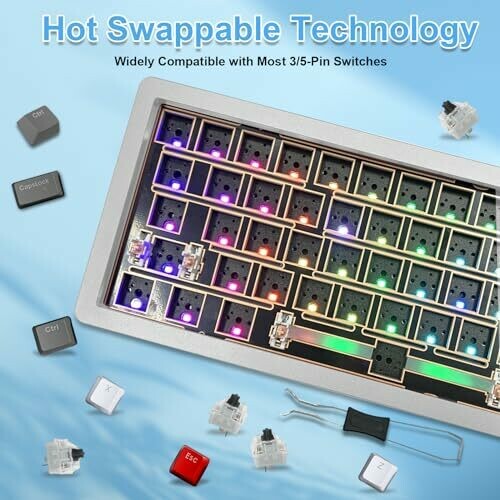• Hot-swappable support lets you mix Cherry MX, Kailh, and Gateron 3- or 5-pin switches without soldering for effortless personalization.