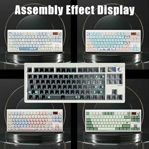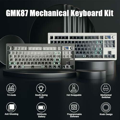 The ZMX GMK87 is an 87-key gasket-mounted hot-swap keyboard kit with a triple-mode wireless and wired interface (Bluetooth 5.0, 2.4 GHz, Type-C). It includes a TFT-LCD display and a metal knob for volume control, supporting VIA software for macro programming and customization. The kit uses a hot-swappable PCB compatible with most 3-pin/5-pin mechanical switches and supports RGB backlighting with south-facing LEDs. Battery capacity is 3000 mAh. The design includes a dual-stage foldable stand and a cable management feature; the case is designed for DIY assembly and customization.