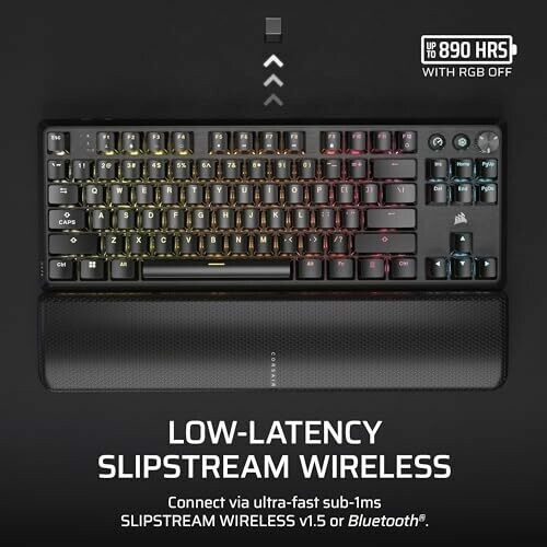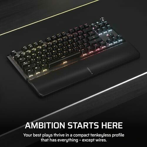 Space-saving Tenkeyless layout. Pre-lubed CORSAIR MLX Red v2 linear switches. Connect via SLIPSTREAM WIRELESS v1.5 or Bluetooth with AES encryption. Two sound dampening layers and pre-lubricated stabilisers for subdued typing acoustics. Game mode to reduce input lag and distractions. 1000Hz polling rate for rapid input reporting.