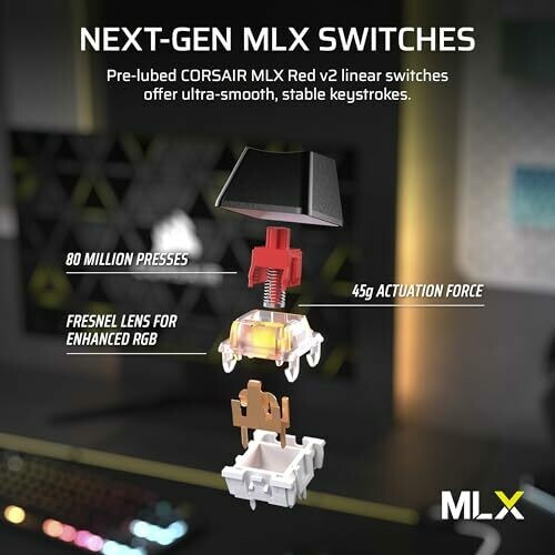 • Pre-lubed MLX Red v2 linear switches deliver smooth, responsive keystrokes with enhanced ultra-bright per-key RGB backlighting.