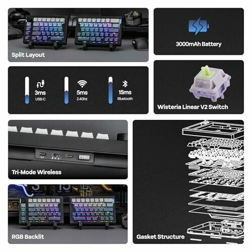 Experience an ergonomic split layout that can be used as two halves or linked for comfortable typing. Enjoy creamy linear switches with the rotary knob for quick volume and multimedia control, QMK/VIA support, gasket mounting, and PBT keycaps for quiet typing.