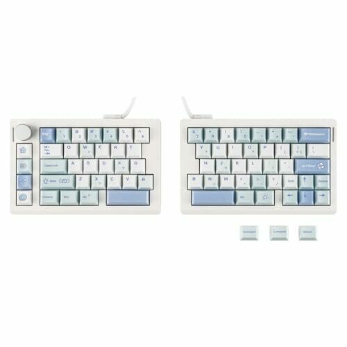 Ergonomic seventy percent split layout with detachable halves for adjustable typing angles and lasting comfort. QMK and VIA compatibility enables advanced key mapping. A rotary knob provides quick volume and media control. Creamy Wisteria Linear V2 switches with PBT keycaps and gasket mounting.