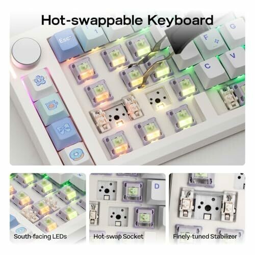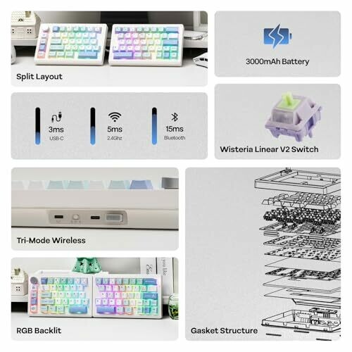 • Creamy Wisteria Linear V2 switches with hot-swap support provide smooth, customizable typing and easy switch upgrades.