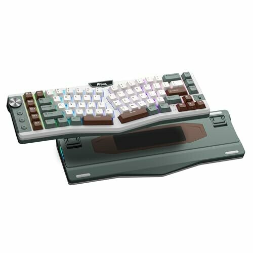 The RK ROYAL KLUDGE A72 Alice 68% layout is a 72-key keyboard with an ergonomic, split, angled design intended to reduce wrist and forearm strain. It supports Bluetooth 5.0, 2.4 GHz wireless, and USB-C wired connections, and includes 15 RGB backlight modes. The keyboard uses a gasket-mounted construction with five internal dampening layers to reduce noise. It features five M1–M5 macro keys and a volume/media control knob. A touch-sensitive nameplate provides access to an online driver interface for remapping keys, macros, and lighting on Windows and macOS. The device has a 7500 mAh battery, offering up to 550 hours of use with RGB off and up to 54 hours with RGB on, with a full recharge time of approximately 14 hours. It supports hot-swappable switches (3-pin and 5-pin) and ships with pre-lubed switch options for customization.