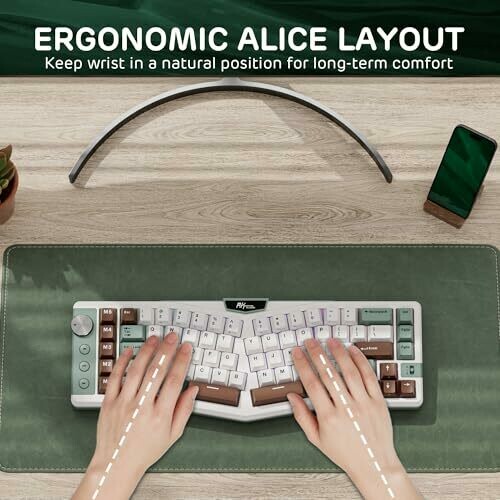• Ergonomic Alice layout with split, angled design to promote natural typing posture and reduce wrist strain.