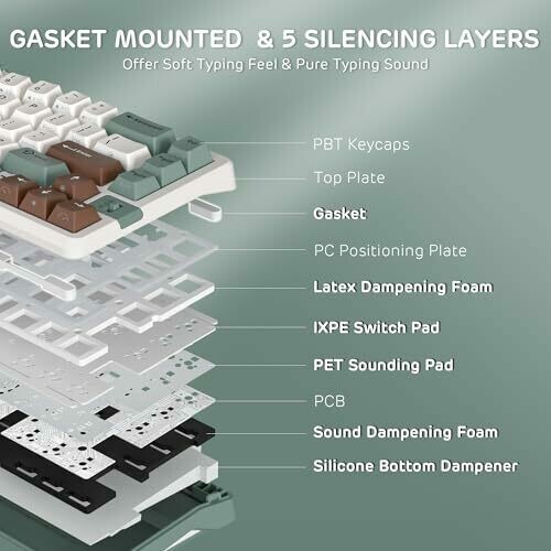 gasket‑mounted design with five internal dampening layers (dual foam, IXPE pad, silicone dampener, PET film).