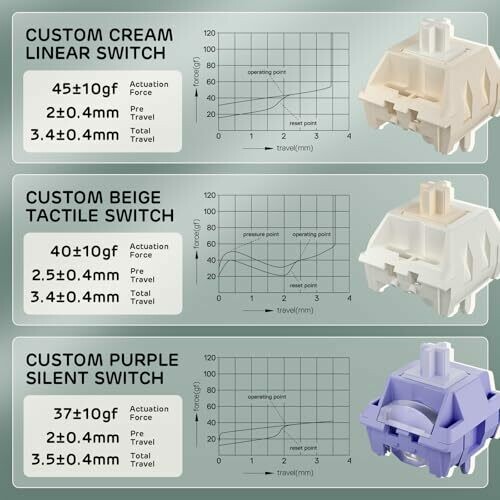 hot‑swappable PCB compatible with 3‑pin and 5‑pin switches; pre‑lubed RK Linear Cream, Tactile Beige, and Silent switches available.