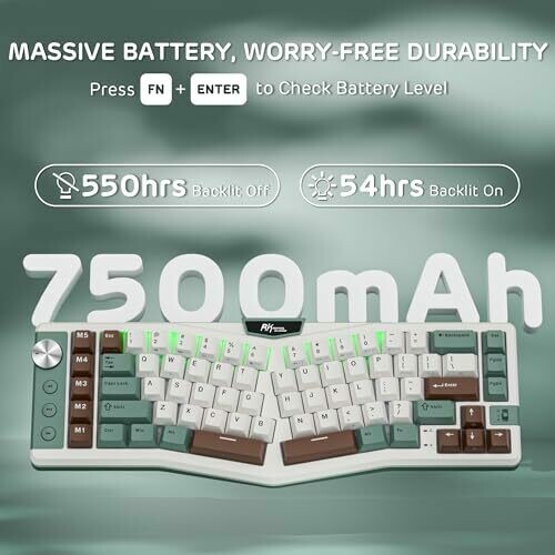 7500 mAh battery; up to 550 hours (RGB off) or 54 hours (RGB on); charging time approximately 14 hours.