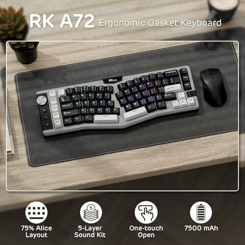 The RK ROYAL KLUDGE A72 Alice keyboard features an ergonomic Alice layout with a 72-key, compact 68% footprint. It supports tri-mode connectivity (2.4 GHz wireless, Bluetooth 5.0, USB-C wired) and offers multiple RGB lighting modes. The keyboard uses a gasket-mounted design with five internal dampening layers to reduce vibrations and noise, paired with Cherry-profile PBT keycaps. It includes five programmable macro keys (M1–M5) and a volume control knob for media management. A touch-sensitive nameplate provides browser-based driver access for key remapping, macros, and RGB customization compatible with Windows and macOS. The device includes a 7500 mAh battery with up to 550 hours of use (RGB off) or 54 hours (RGB on); charging time is approximately 14 hours. It is hot-swappable on the PCB and supports 3-pin and 5-pin switches, with pre-lubed RK Linear Cream, Tactile Beige, and Silent Switch variants available.