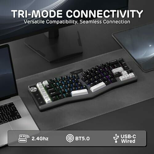 Ergonomic Alice layout with a compact 68 percent footprint and 72 keys designed for natural typing. Tri-mode connectivity (Bluetooth, 2.4 GHz, USB-C) with gasket mounting, five macro keys, and a volume knob. Touchable nameplate enables on-device customization.