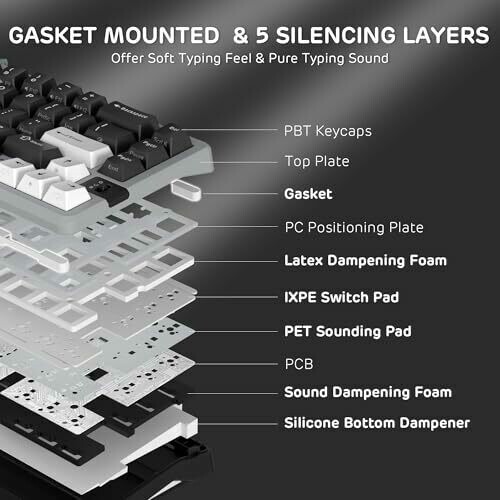 • Gasket-mounted konstruktion with multi-layer dampening for a cushioned typing feel and reduced hollow sounds