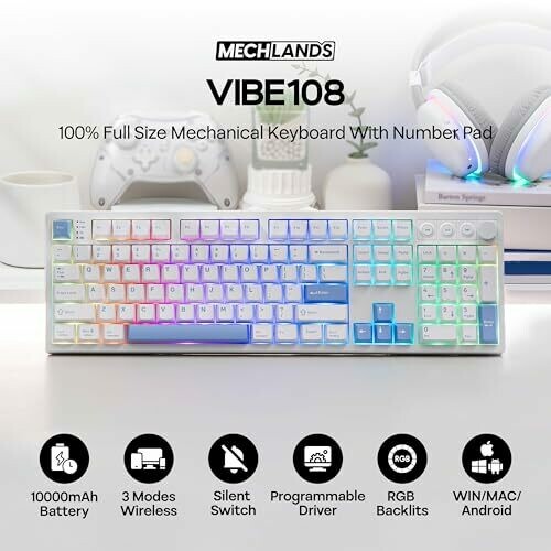 MechLands VIBE108 Full Size Mechanical Keyboard with dedicated media controls, volume knob, and quick commands. Features tri-mode wireless connectivity, USB-C wired option, and 2.4 GHz wireless for versatile device pairing, plus hot-swappable switches and gasket mounting for enhanced acoustics.