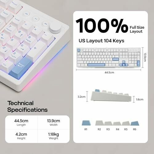 • 100% full-size layout with 104 keys designed for productivity and gaming.