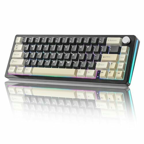 Compact 65% mechanical keyboard with a multifunction knob, aluminum gasket mount, tri‑mode connectivity, pre‑lubed switches and stabilizers, poron and PET pads for acoustics, and south‑facing LEDs delivering muted lighting for work and play.