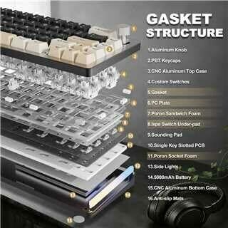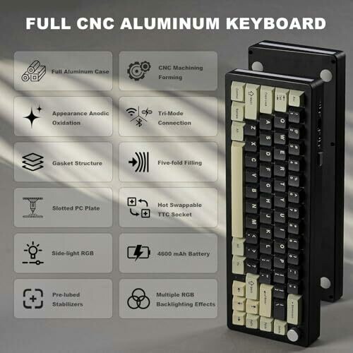 The keyboard features 66 keys plus a multifunction knob, in a 65% layout with a gasket-mounted aluminum chassis. Construction uses CNC machining with anodic oxidation for durability and corrosion resistance. It supports three modes of connection—Bluetooth, 2.4 GHz wireless, and wired—connecting to up to four devices simultaneously. Battery capacity is 5000 mAh with an estimated up to 90 hours of typing, depending on usage. The keyboard is hot-swappable and compatible with 3-pin or 5-pin switches, and includes pre-lubed switches and stabilizers. It uses poron sandwich foam, poron socket foam, and PET sound pads in the assembly. RGB features include 14 default effects and 8 backlight colors with south-facing LEDs. NKRO support allows simultaneous key presses. Compatibility includes Windows and Mac systems, with optional software available for DIY settings on Windows only.