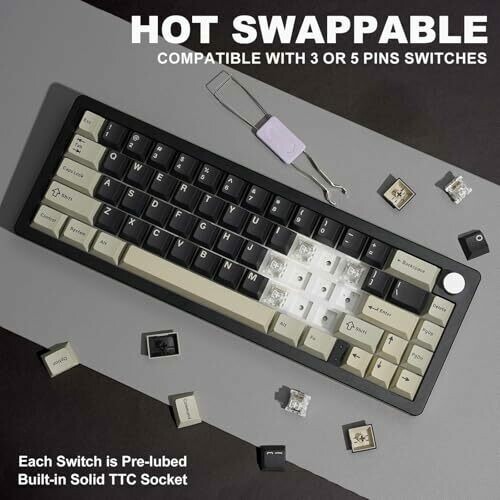 • Hot‑swap capability with 3‑pin/5‑pin switches, pre‑lubed switches and stabilizers for a smooth, custom typing experience.