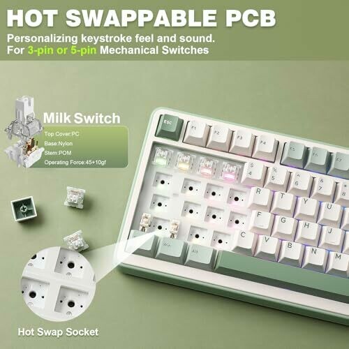 • Hot-swappable sockets compatible with 3-pin and 5-pin switches for easy customization.