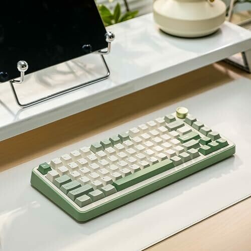 75% keyboard with knob; 82 keycaps; compact form including number keys, function keys, and arrow keys. Multifunction knob adjusts volume and backlit effects; long-press to switch between gaming and office modes. Gasket mount with 5-layer padding, noise isolation design, double-shot keycaps, precision-tuned stabilizers, and pre-lubricated switches. Hot-swappable PCB compatible with 3-pin and 5-pin switches. Pre-lubed linear and tactile switches provide consistent keystroke feel. Supports Bluetooth, 2.4Ghz wireless, and wired connections; built-in 4000mAh battery. Programmable gasket-mount keyboard with backlight; over 20 built-in backlight modes and south-facing LEDs; programmable software to redefine keys, macros, and RGB settings. Compatible with Windows and macOS.