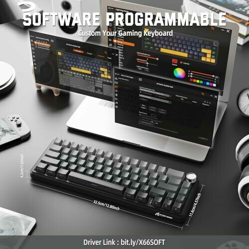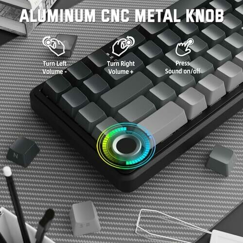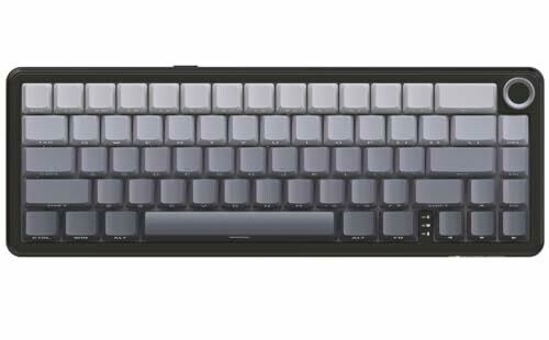 Ultra-compact 60 percent design frees desk space while keeping essential controls within reach. 66-key layout with a built-in volume knob and tri-mode connectivity (Bluetooth, 2.4 GHz, USB-C). Durable side-printed gradient PBT keycaps for long-lasting wear.