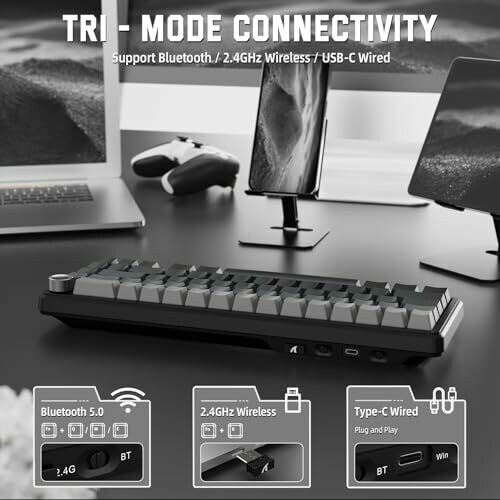 • Tri-mode connectivity (Bluetooth, 2.4GHz wireless, and wired USB-C) for versatile multitasking across devices.