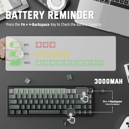 The keyboard features a 60% compact design with 66 keys and a volume knob. It uses a gasket mount with multiple sound-insulation layers to reduce noise and provide a soft typing experience. It supports three connection modes: