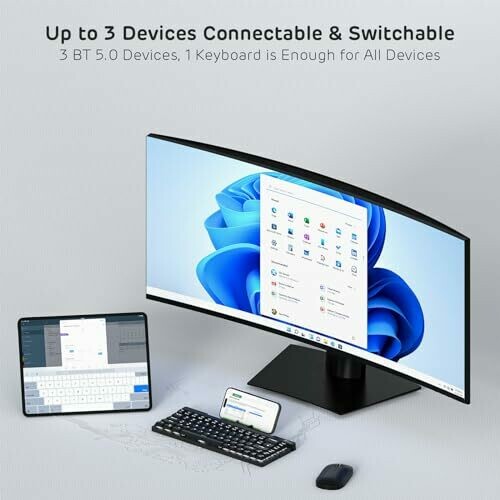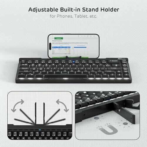 Built-in stand holder supports screens from tablets to phones and can magnetically attach to the foldable keyboard.