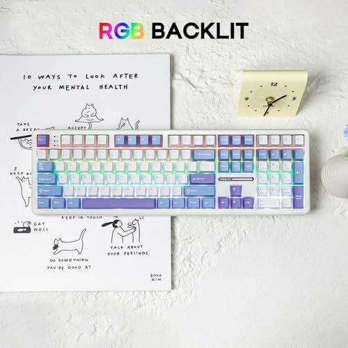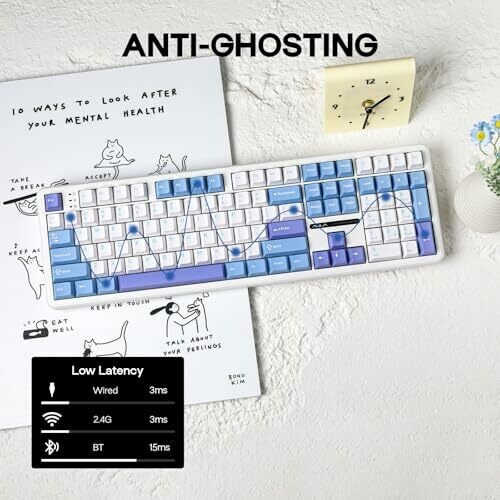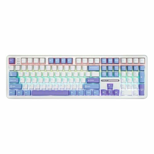 Experience a full-size wireless mechanical keyboard with a white and blue design. It provides 4000mAh battery for long sessions and flexible connectivity across PC, Mac, and Android. With hot-swappable switches, 108 anti-ghosting keys, and versatile wired and wireless modes.