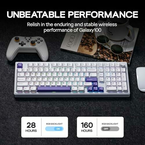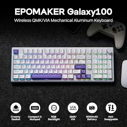 The Galaxy100 is a full-size, wireless mechanical keyboard featuring an 8000mAh battery for prolonged use. It offers three connection modes: