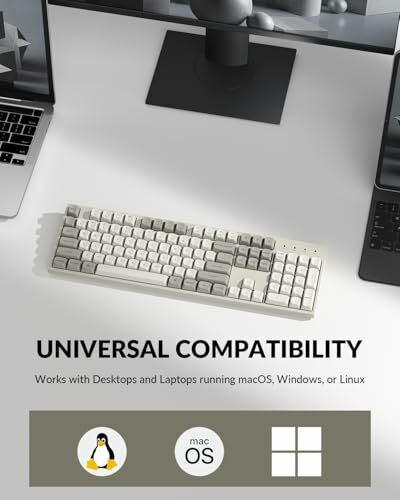 • Compatible across macOS, Windows, and Linux with a system toggle and OS-specific keycaps for easy switching.