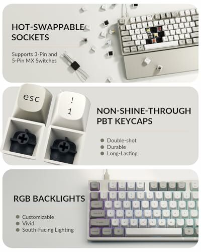 • Hot-swappable switches paired with durable PBT keycaps for a lasting, satisfying keystroke feel.