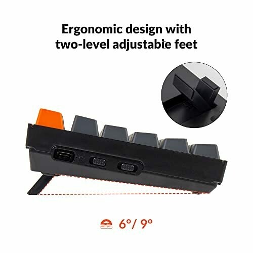 Two-level adjustable feet (6º and 9º) with an inclined bottom frame for comfortable typing.