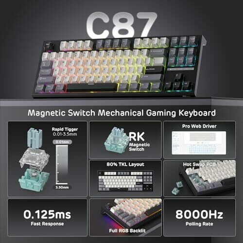 RK Royal Kludge C87 87 Keys Mechanical Keyboard W/Adjustable Actuation Point, 8K Polling Rate, for FPS Gamer