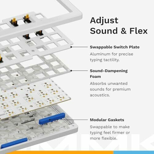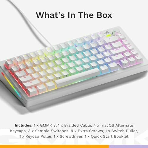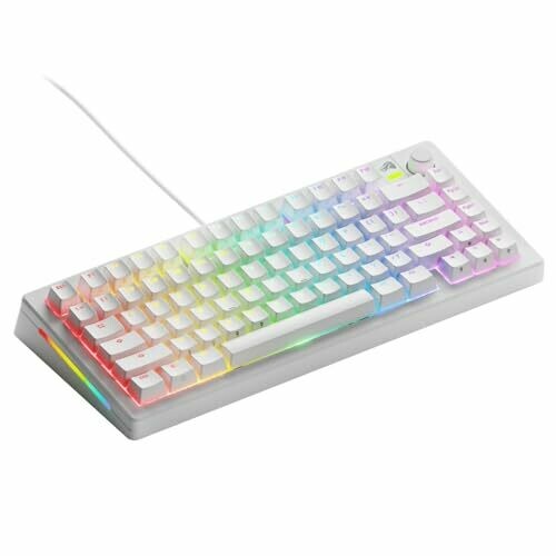 Compact 75 percent footprint with modular setup to tailor feel and look. Durable Doubleshot PBT keycaps and an aluminum switch plate deliver a premium, long-lasting build. Supports 3/5-pin switches and American QWERTY layout in a clean white finish.